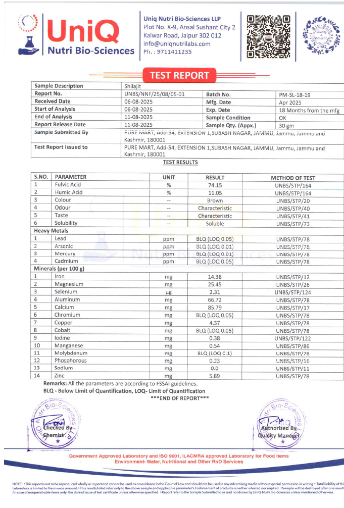 The Shilajit at PureMart is tested, certified and authenticated in Govt. Certified Laboratory as FSSAI Standards. It is recommended by Dieticians and Nutritionists to consumer raw shilajit resin than shilajit capsule or powder form & adviced to always consult your doctor before takiing Shilajit.